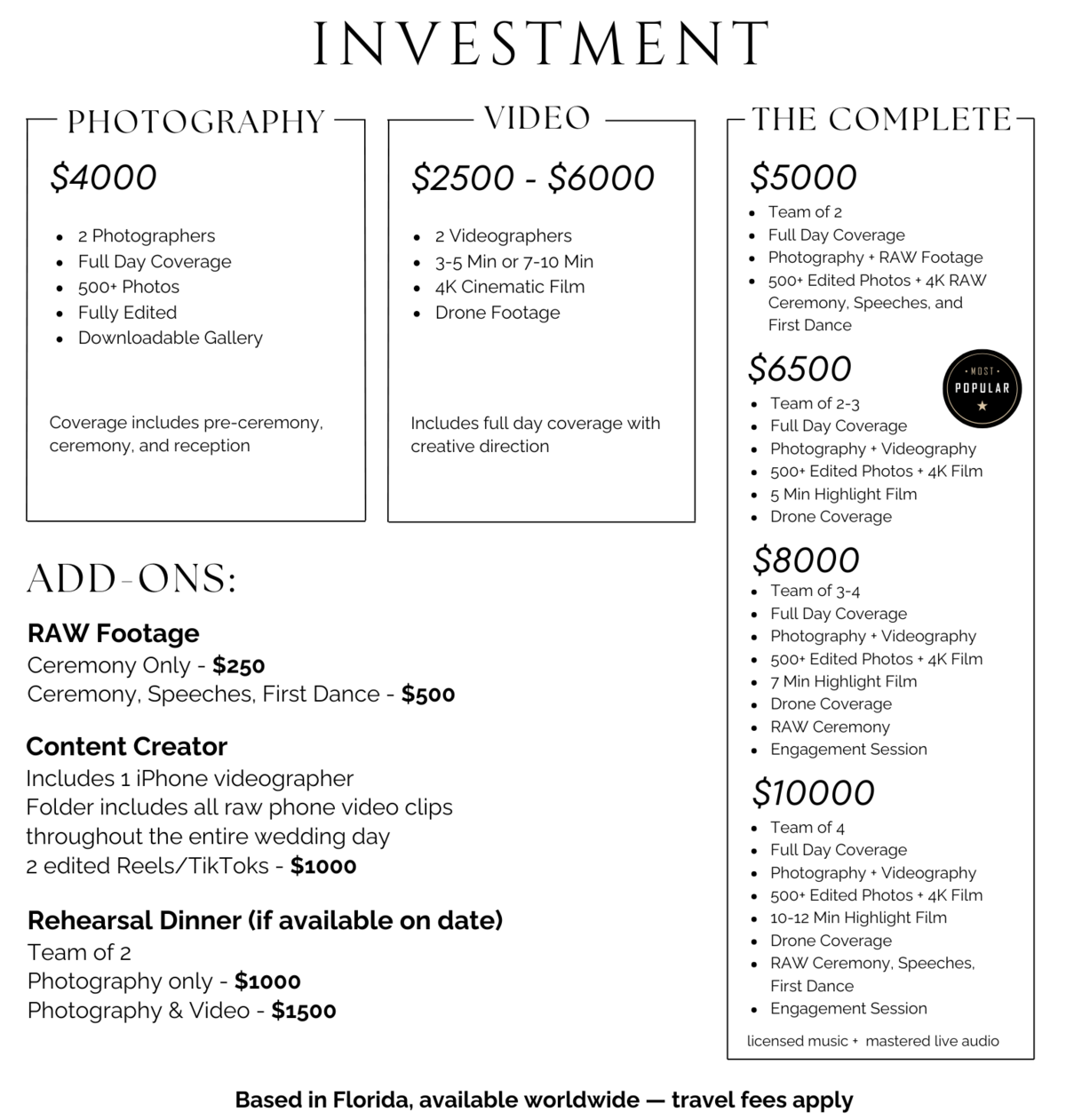 Your wedding film should be more than just a video—it should be a cinematic experience that brings your love story to life. With our expert videography, we capture the emotions, the laughter, the vows, and every little detail that makes your wedding day extraordinary. Based in St. Augustine, Florida, we specialize in creating stunning wedding films that allow you to relive your day over and over again. Each film is carefully crafted to reflect your unique love story, blending heartfelt storytelling with a cinematic touch.